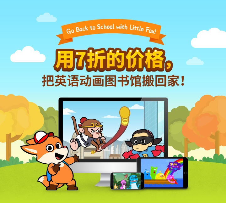 用英语动画片、儿歌和游戏让孩子的英语学习不再枯燥无味!9月开学季,订阅12个月的学习套餐,今年我们提供7折优惠券!优惠券既可用于新会员注册,也可用于在使用中的账户续费。别错过一年一次的优惠!