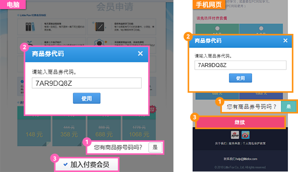 3在“您有商品券号码吗?”这里点击”是“,并输入您的优惠券代码,并点击”使用“。 之后输入会员信息,完成付款。